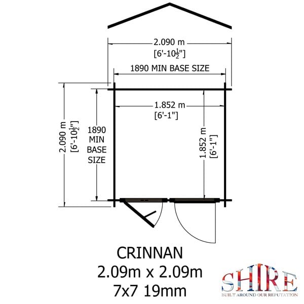 Width (mm) 2090g Depth (mm) 2090 Ridge Height (mm) 2095 int 2263 ext Eaves Height(mm) 1868 int 1943 ext Roof Timber (mm) 12mm T&G Roof protection Grey Felt Floor Material 12mm T&G Wall Type 19mm interlocking log Pressure Treated floor Bearers 34x62 Window Quantity 1 Door(s) 1 single Lock Type mortice lock Glazing Material Glass