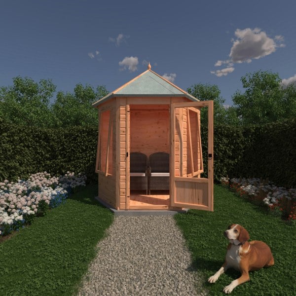 Transform your outdoor space with the Shire Keswick Hexagonal Summerhouse. Measuring 6x6 feet, this stunning gazebo is designed to bring charm and elegance to any garden, making it the perfect spot for relaxation or entertaining guests. Crafted from high-quality FSC timber, the summerhouse features beautiful traditional mortised and tenoned doors and windows, ensuring both durability and aesthetic appeal.