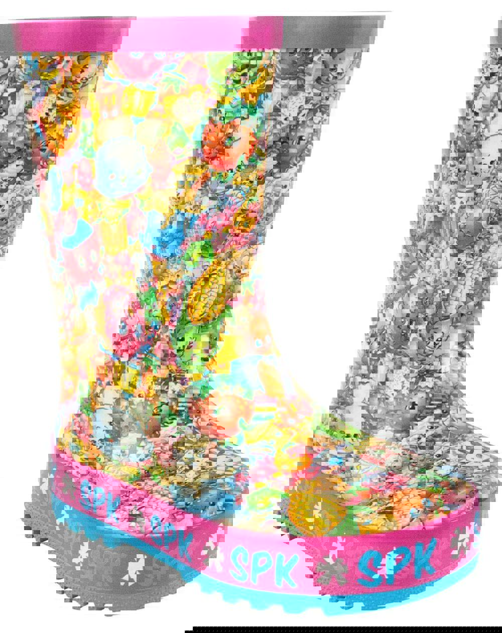 The design across these wellies sees an all-over print featuring some of the fan-favourite Shopkins characters in a colourful and detailed repeated design, complete with pink ankle cuff and upper outsole with a repeated "SPK" motif around the outside