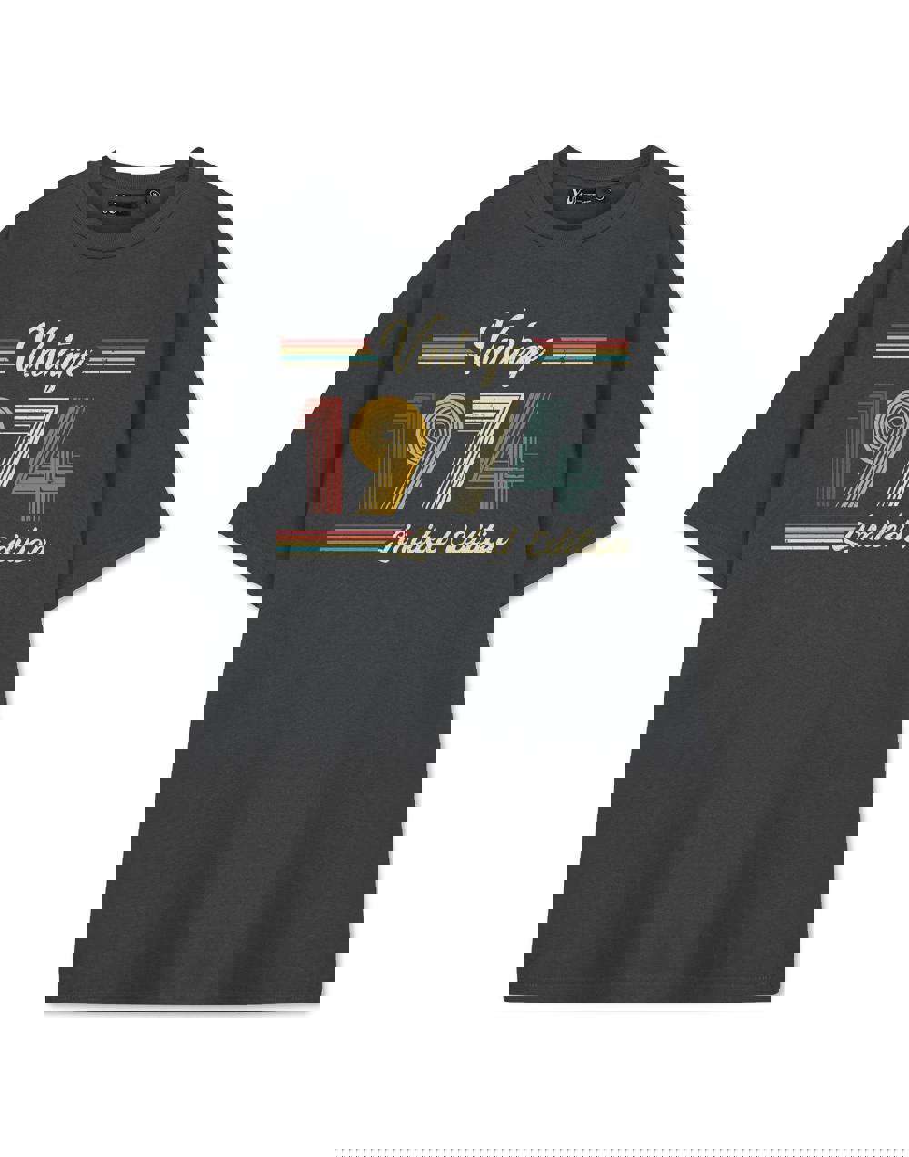 So, why wait? Embrace the nostalgia, embrace the style, and embrace the fun with our Show Me The Merch Mens Vintage 1974 Graphic Tee in Grey