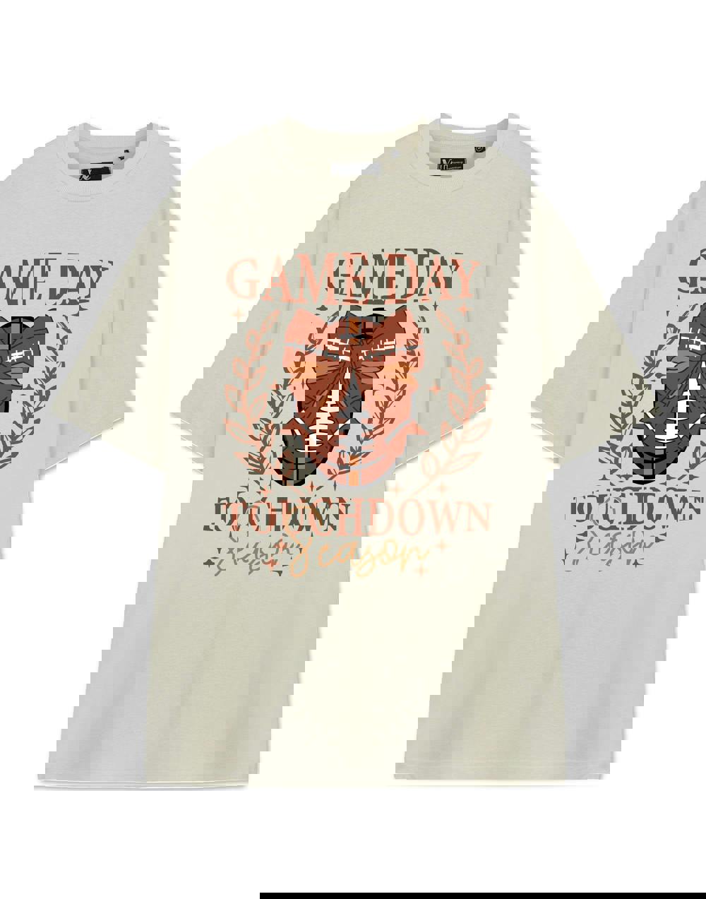 Elevate your game day style with the Show Me The Merch Women's Beige Football Theme Classic Graphic Tee! Showcasing a timeless football theme with the text "GAME DAY, TOUCHDOWN, season," this tee is a must-have for any football enthusiast