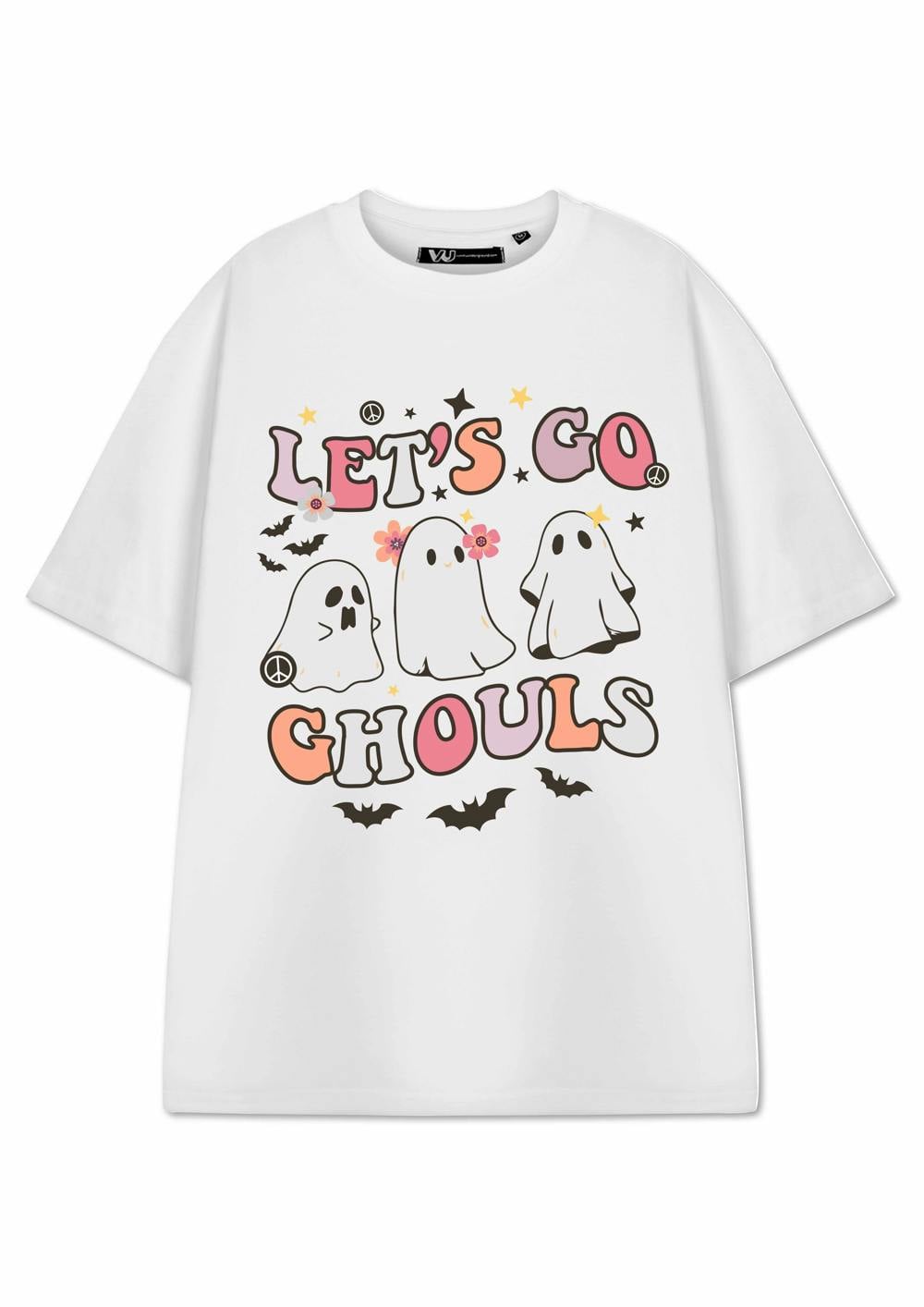 Wear it to Halloween parties, movie nights, or just when you're feeling a little ghostly - the choice is yours! So, why wait? Join us in celebrating the darker side of fashion and grab your own Show Me The Merch Let's Go Ghouls Women's White Short Sleeve Graphic Tee today