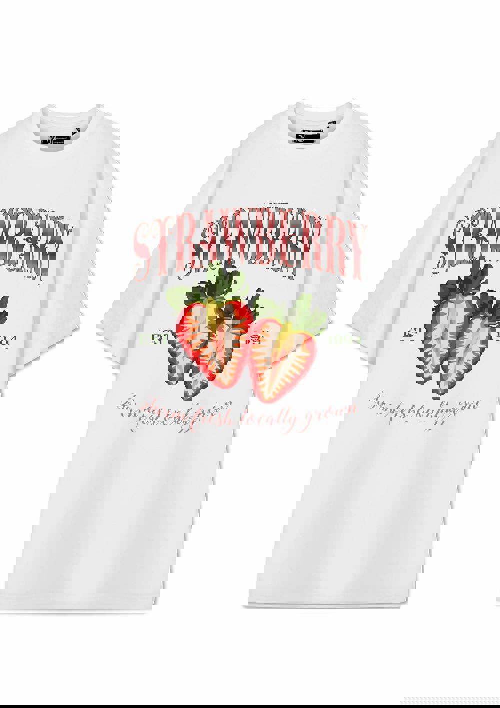 The strawberry graphic pops on the crisp white background, making it a must-have for any fruit lover
