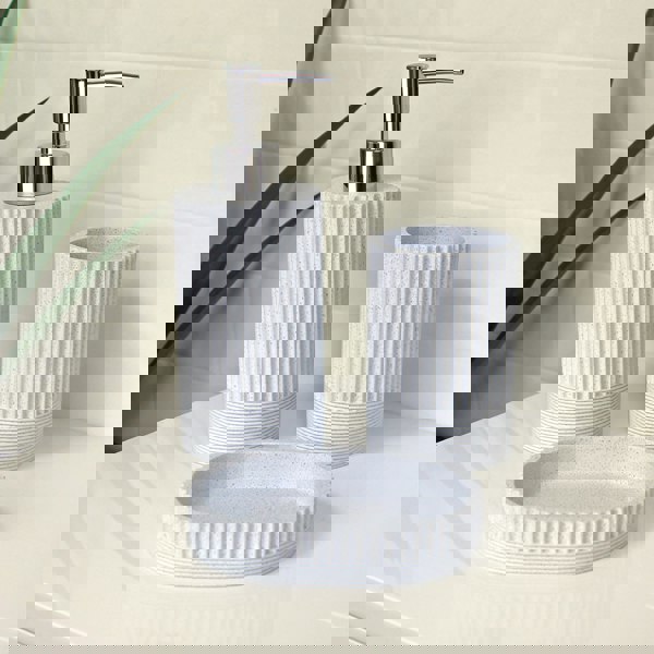 Keep your Bathroom surfaces clear and your essentials organised with the Tranquil Bathroom Accessory Set. Tranquil in the palest of blue, features a ribbed design, adding texture and visual interest to its overall appearance. Tranquil, with a hint of blue, makes these Bathroom accessories fresh and modern.