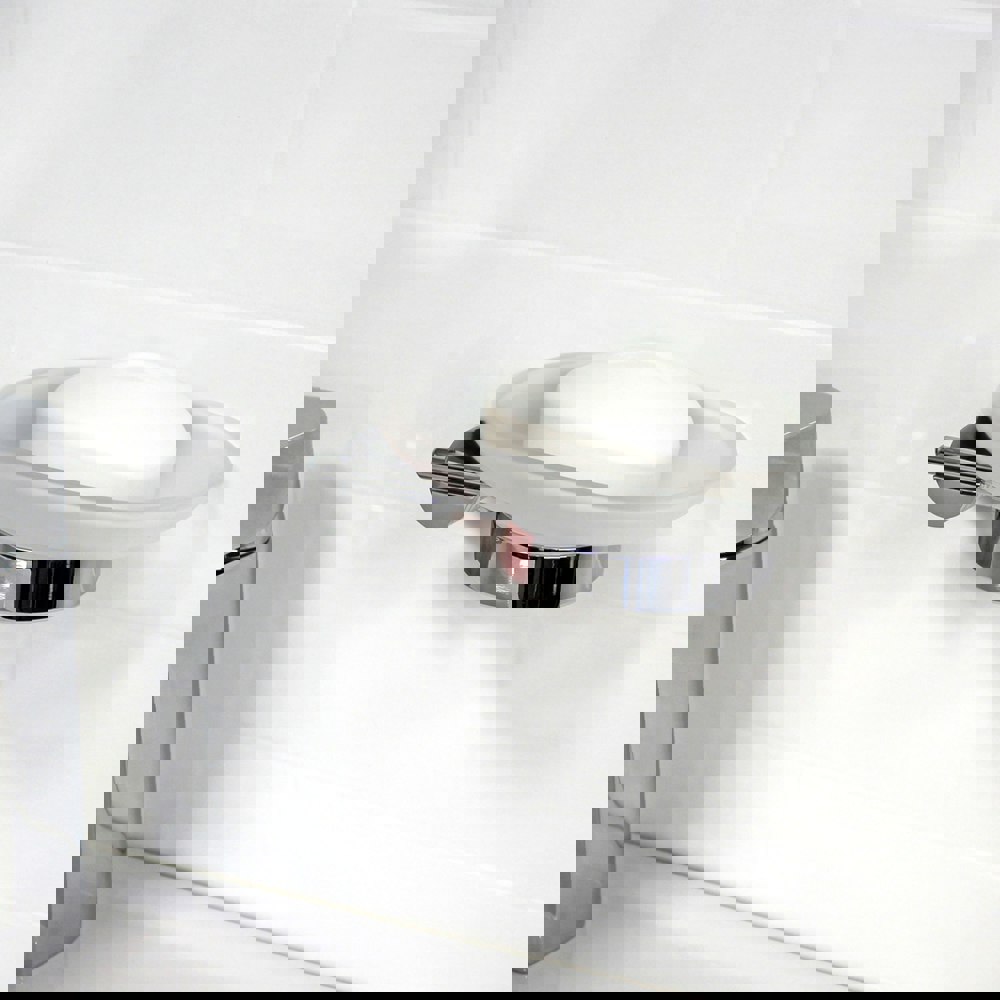 A stylish and functional fixture, the Vitality Soap Dish offers practical storage for toiletries and helps keep the bath and sink area tidy. Its contemporary design integrates seamlessly into any bathroom decor. This quality accessory is manufactured using high grade Stainless Steel and Frosted Glass, and is finished in a durable chrome plated finish.