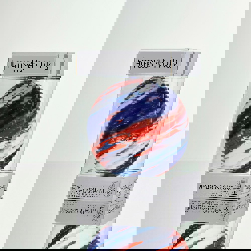 Celebrate America’s Independence Day with our 10cm Friendship Ball – Happy 4th July. Hand-blown with vibrant red, white, and blue swirling colours, this unique glass keepsake captures the spirit of patriotism and celebration.