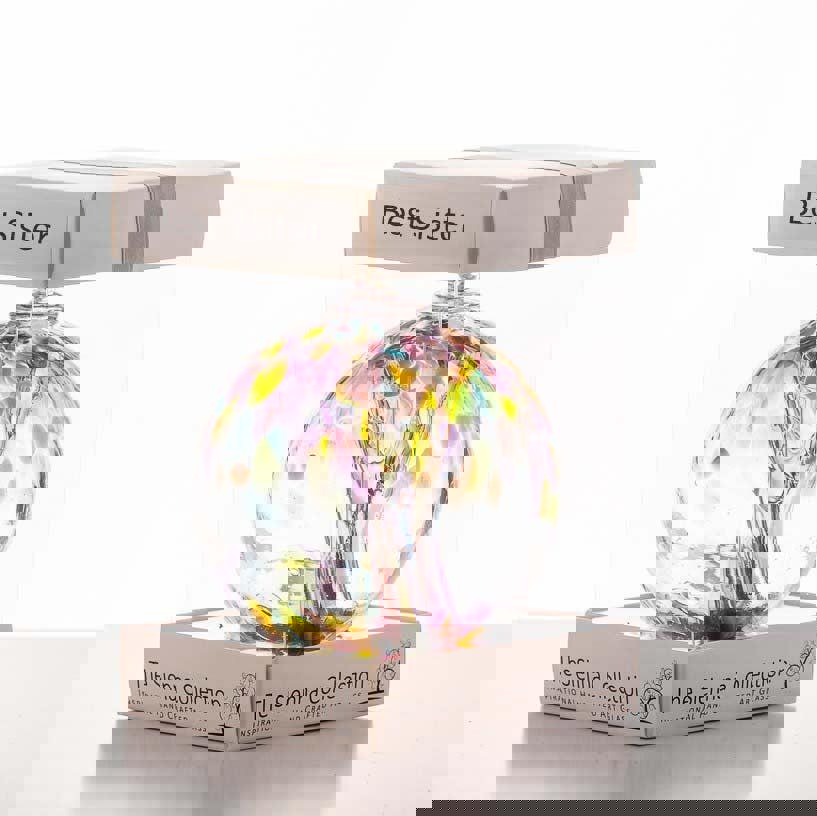 This Sienna Glass spirit ball is a stunning and meaningful gift for any special occasion. Hand blown by skilled craftsmen, each ball is unique and showcases beautiful coloured glass. Its vibrant colours make it a captivating piece when hung in a window, a bright spot indoors, or even in the garden.