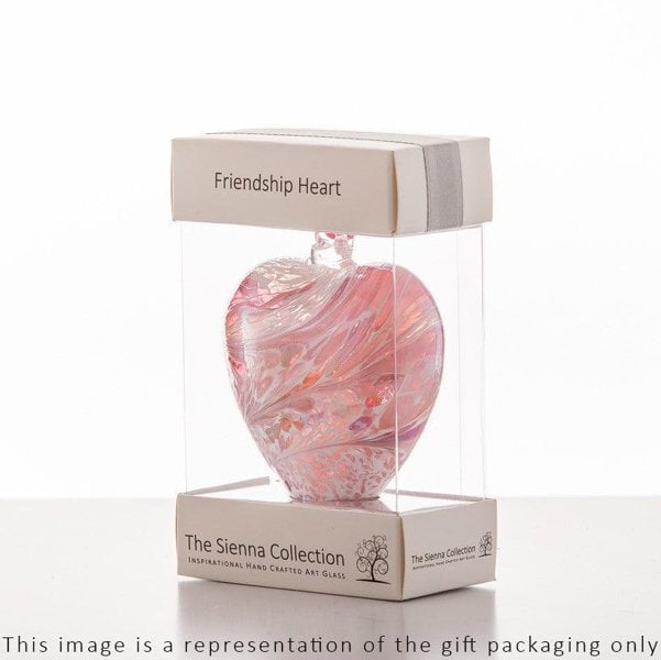 This Sienna Glass friendship heart is a stunning and meaningful gift for any special occasion. Hand blown by skilled craftsmen, each heart is unique and showcases beautiful white glass. Its vibrant colours make it a captivating piece when hung in a window, a bright spot indoors, or even in the garden.