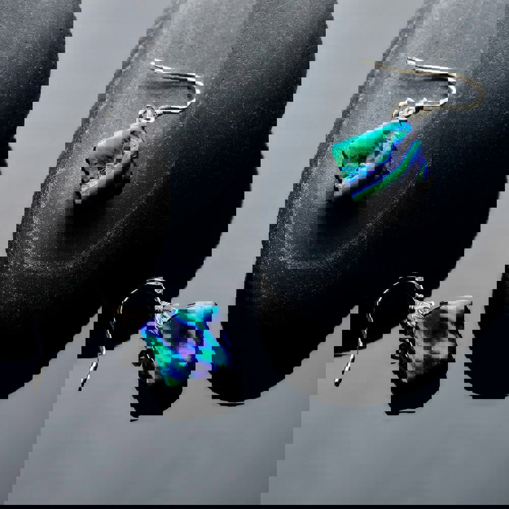 Add a touch of shimmering elegance to your look with our Dichroic Glass Earrings – Midnight Blue & Dark Green. These handcrafted earrings feature dichroic glass that reflects rich midnight blue and dark green hues, creating a dynamic play of colour and light.