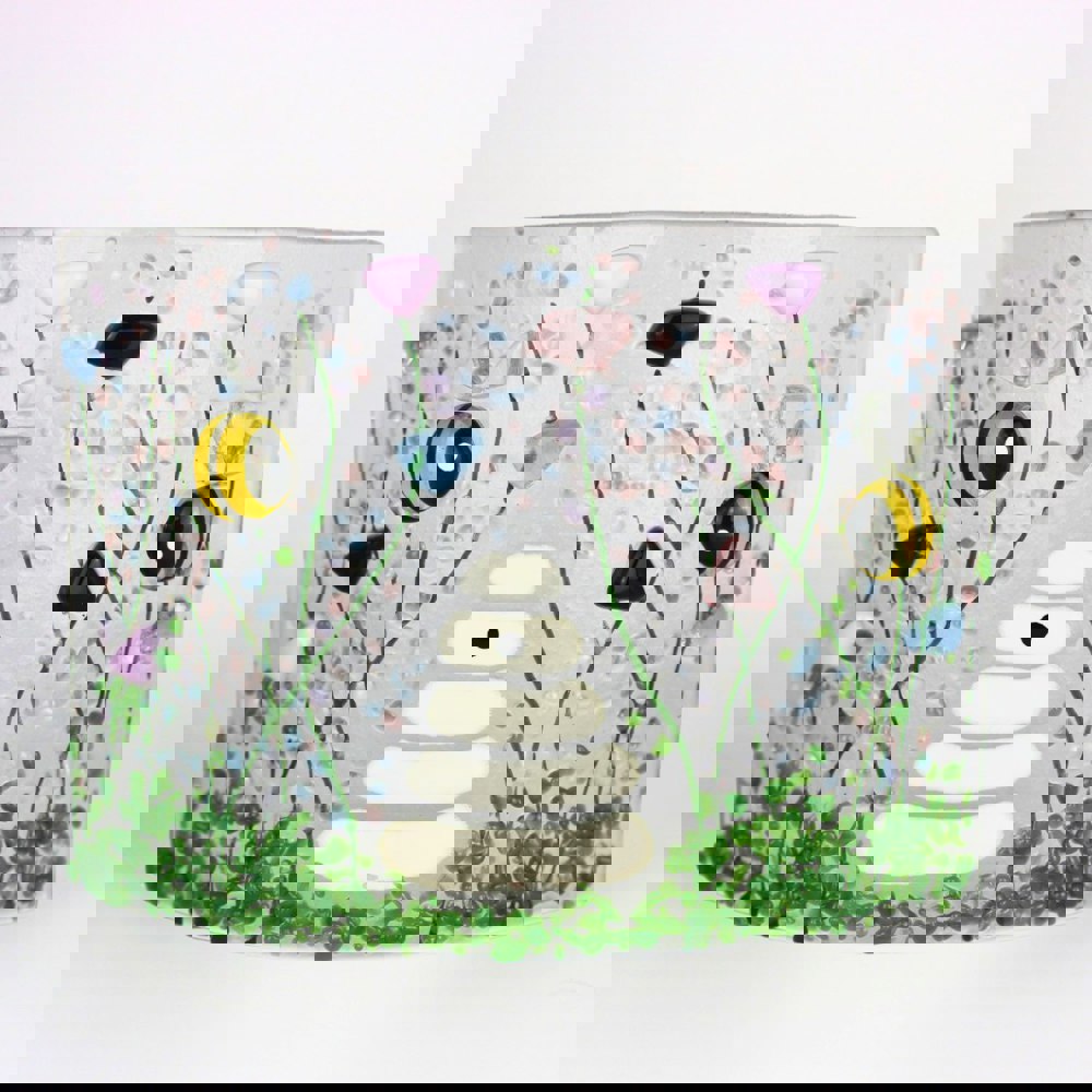 Bring a touch of nature indoors with our Handmade Fused Glass Curve – Bumble Bee & Violet. Featuring a cheerful bee hovering above delicate violet flowers, this freestanding glass panel is crafted using traditional kiln-fusing techniques.