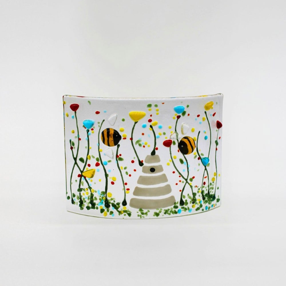 Celebrate the beauty of British wildlife with our Handmade Fused Glass Curve – Bumble Bee & Wildflowers. This charming freestanding glass panel features a busy bee surrounded by colourful meadow flowers, all kiln-fused by hand into a gently curved piece that comes alive in natural light.