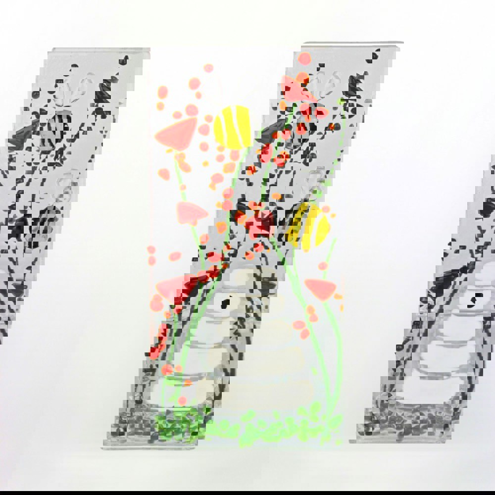 Bring vibrant colour and countryside charm into your home with our Handmade Fused Glass Tea Light Holder – Bumble Bee & Poppy. Featuring a cheerful bee alongside a bold red poppy, this kiln-fused glass panel glows warmly when lit from behind with a tea light (not included).