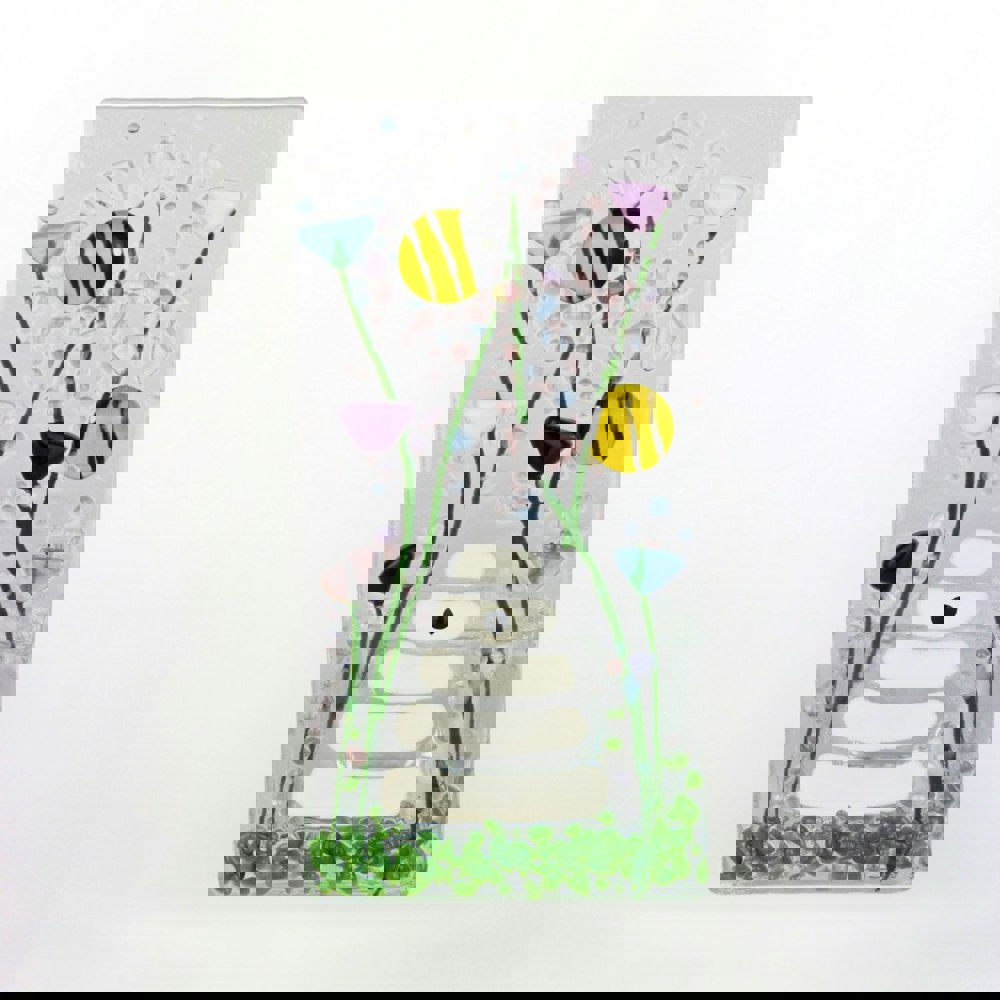 Bring gentle charm and a touch of the wild into your home with our Handmade Fused Glass Tea Light Holder – Bumble Bee & Violet Flowers. This beautiful freestanding panel features a sweet bee hovering among soft purple blooms, fused into glass using traditional kiln-fired techniques.