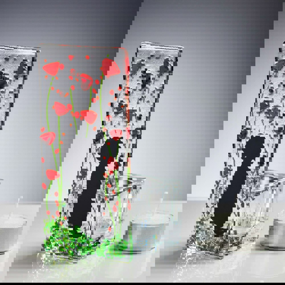 Add warmth and personality to your home with our Handmade Fused Glass Tea Light Holder – Dog & Poppy. This freestanding glass panel features a playful dog amidst vibrant red poppies, created with traditional kiln-fused glass techniques.