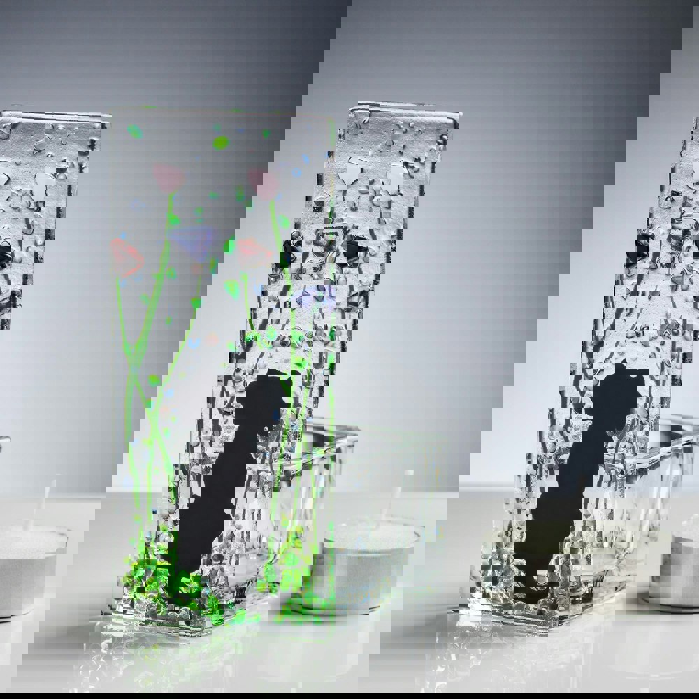 Add warmth and charm to your space with our Handmade Fused Glass Tea Light Holder – Dog & Violet. This freestanding glass panel showcases a loving dog surrounded by delicate violet flowers, crafted with kiln-fused glass techniques.