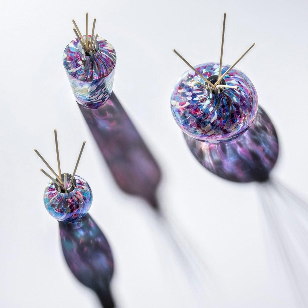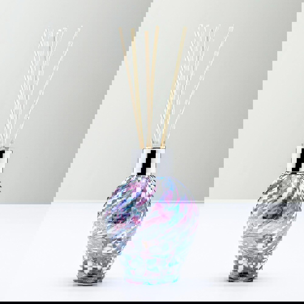 This handcrafted reed diffuser, created using the mouth blowing glass method, is a stunning and unique piece that adds a touch of elegance to any home. With its beautiful decoration featuring colours, with an iridescent finish, it stands out as a visually captivating and stylish accent.