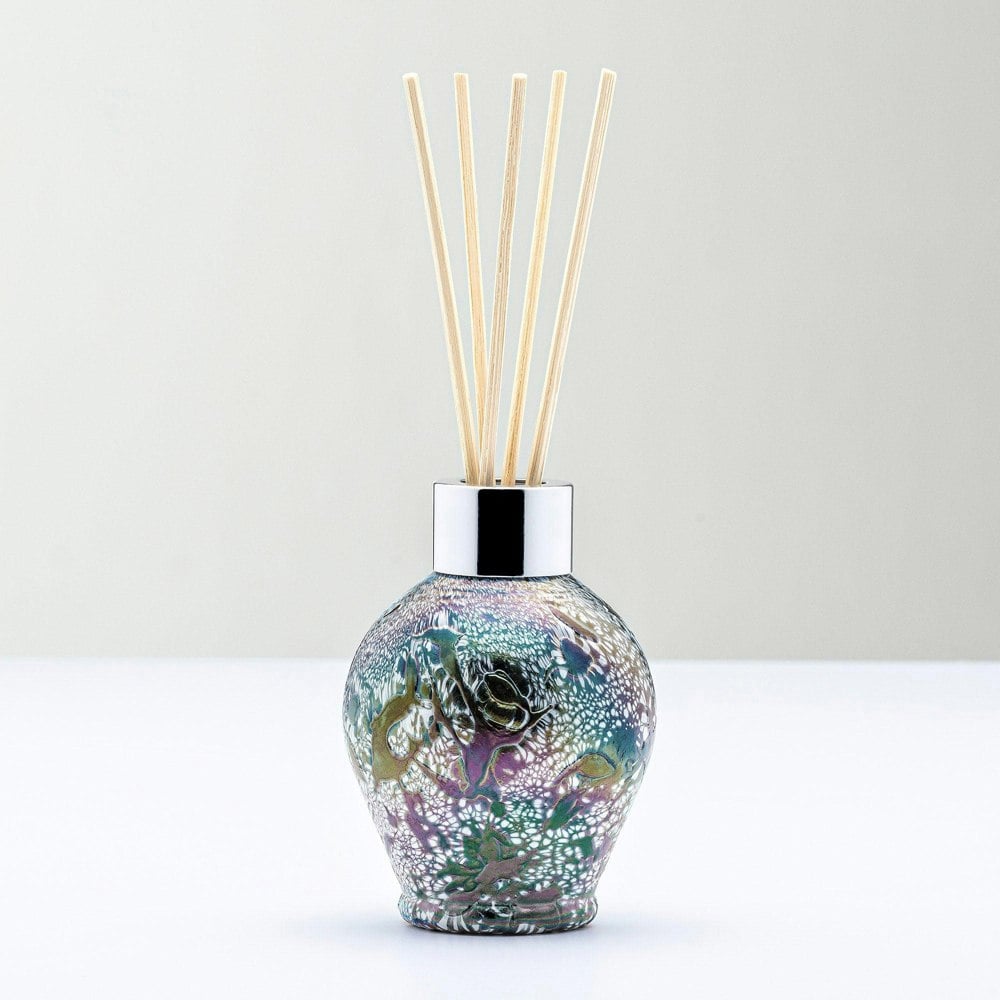 This handcrafted reed diffuser, created using the mouth blowing glass method, is a stunning and unique piece that adds a touch of elegance to any home. With its beautiful decoration featuring colours, with an iridescent finish, it stands out as a visually captivating and stylish accent.