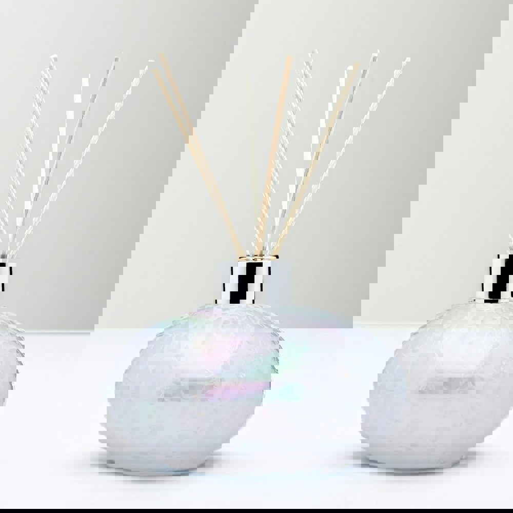 This handcrafted reed diffuser, created using the mouth blowing glass method, is a stunning and unique piece that adds a touch of elegance to any home. With its beautiful decoration featuring colours, with an iridescent finish, it stands out as a visually captivating and stylish accent.
