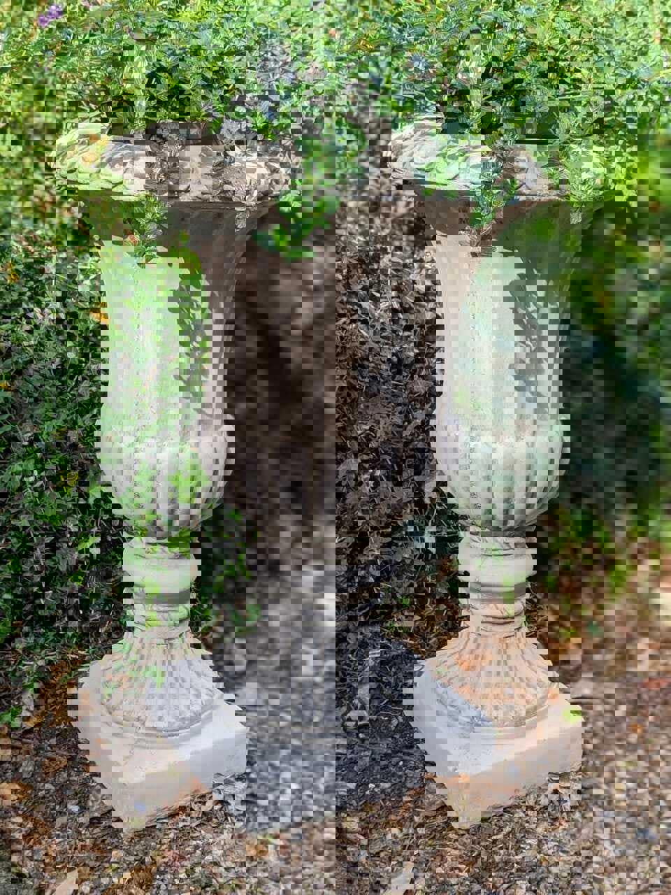 This large and very elegant stone cast urn with classic Greek design and wonderful detail will look fabulous at large backyards, patios or will enhance the display of the garden as driveway ornament. A classic sophisticated design and genuine quality. With its stunning design, antique-look, intricate details, it is sure to bring elegance wherever it is placed. Heavy and solid, this will last a lifetime. A superb addition to your garden.