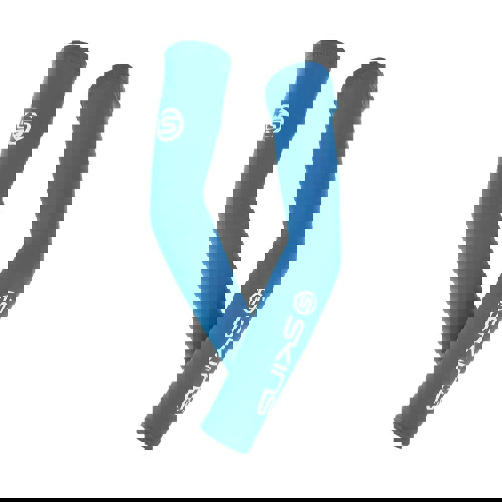 These men’s arm sleeves are made from a polyester and elastane blend, finished in blue and white. The design combines a plain base with contrast detailing and a logo for a clean, sporty look.