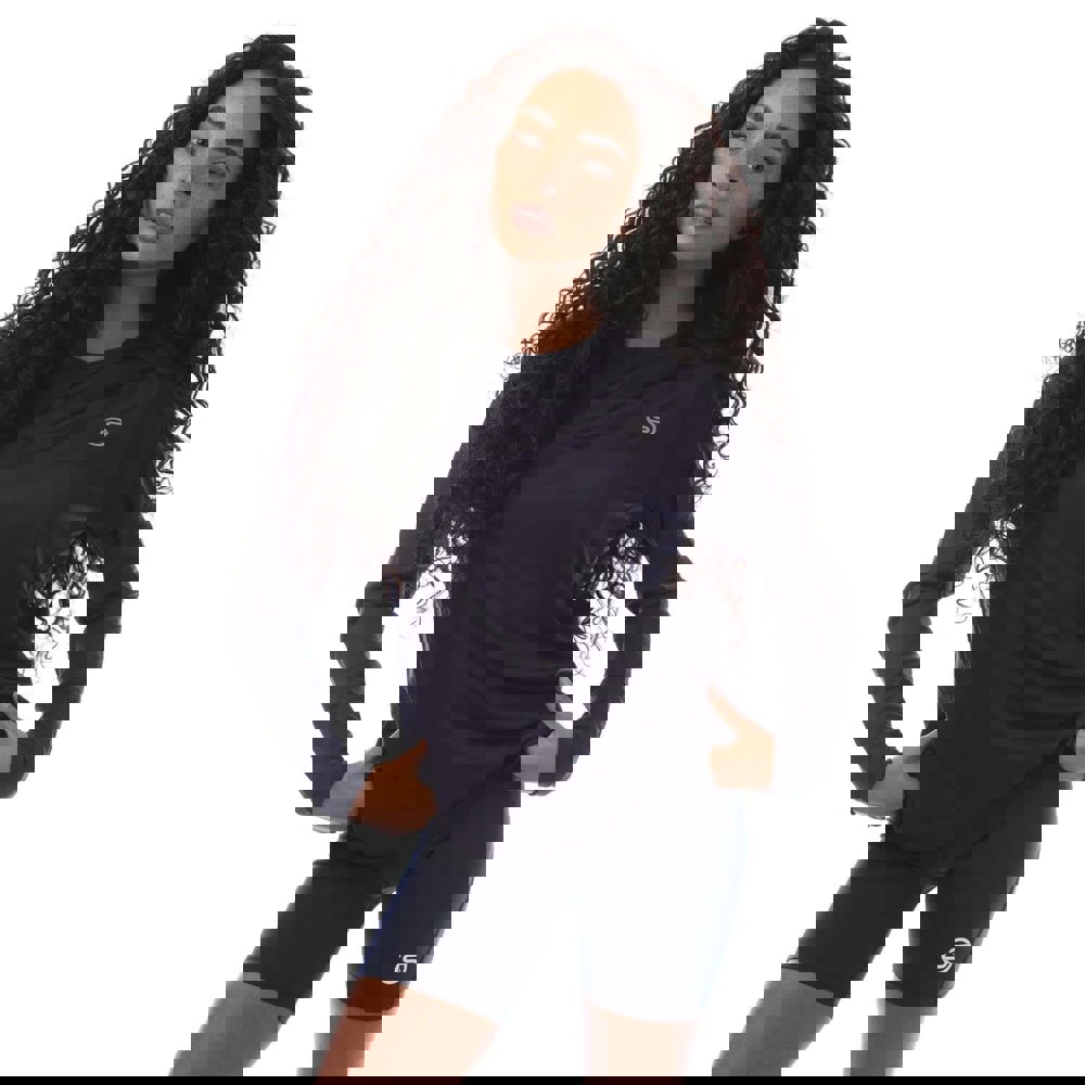 Skins Women’s Series-3 long-sleeved T-shirt in navy, made from 100% polyester. The design combines a plain finish with logo detailing and reflective detail. A crew neckline and raglan long sleeves create a clean, sporty silhouette, while stitched cuffs and a stitched hem keep the edges neat.