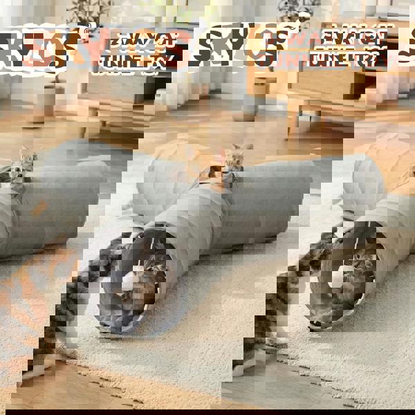 Bring endless fun and adventure to your pet’s playtime with the Skylos 3-Way Cat Tunnel. This Y-shaped tunnel features a wide tri-directional design that lets your cat kitten or small puppy dart hide and explore to their heart’s content. Crafted from durable faux fur and taffeta with a spring steel frame it’s scratch-resistant easy to clean and pops open in seconds for instant play. The central observation hole and detachable hanging pom-poms keep your pet engaged while the foldable design and lightweight build make it perfect for storage or travel. With built-in connectors you can even link multiple tunnels to create a custom maze for extra excitement. Key Features