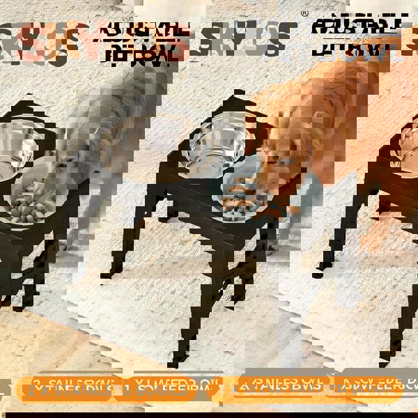 The Skylos Elevated Dog Bowl features 5 adjustable heights (8cm to 31cm) to suit small medium and large pets. It reduces strain on joints and encourages better posture making it perfect for senior and large breed dogs. The included slow-feeding bowl helps prevent bloating acid reflux and obesity by slowing down your pet's eating pace.
