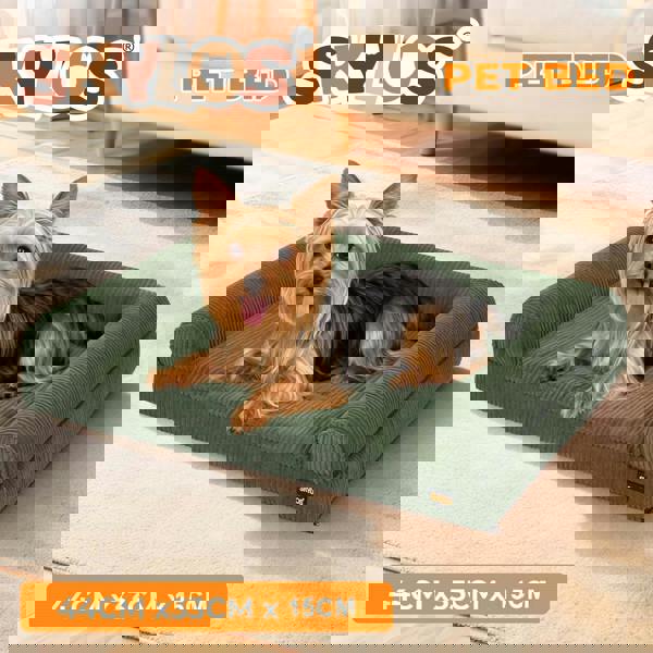 This soft dog bed features a durable corduroy fabric cover combined with padded PP cotton armrests that provide a sense of security and head support. The sofa-style base is made with egg crate foam to help distribute weight evenly and reduce pressure on joints. A waterproof inner lining protects the foam from spills and accidents while the removable machine-washable cover makes this a truly washable dog bed for modern homes.