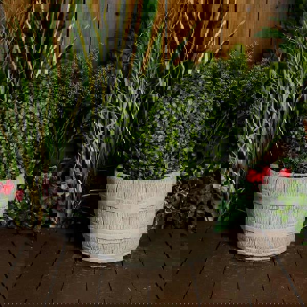 Solid stone cast planter with simple barrel design would be a attractive addition to any garden. The planter is brand new but designed and dyed to look perfectly aged, pot has drainage. A beautiful example of quality stoneware which cannot fail to impress. A beautifully decorated outdoor arrangement and genuine quality. This lovely and pleasant barrel plant pot would look perfect in any garden!