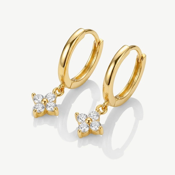 These gold flower huggie earrings sit close to the ear with a small floral drop that moves gently as you walk. The cubic zirconia stones catch the light in a natural way — noticeable, but never too much.