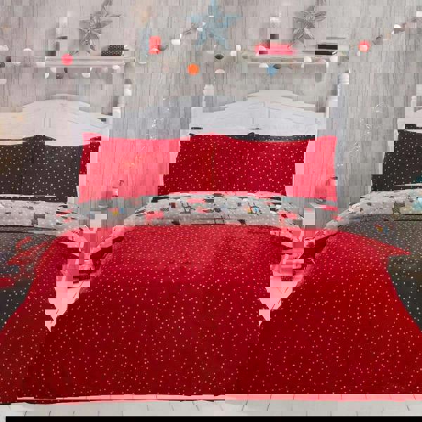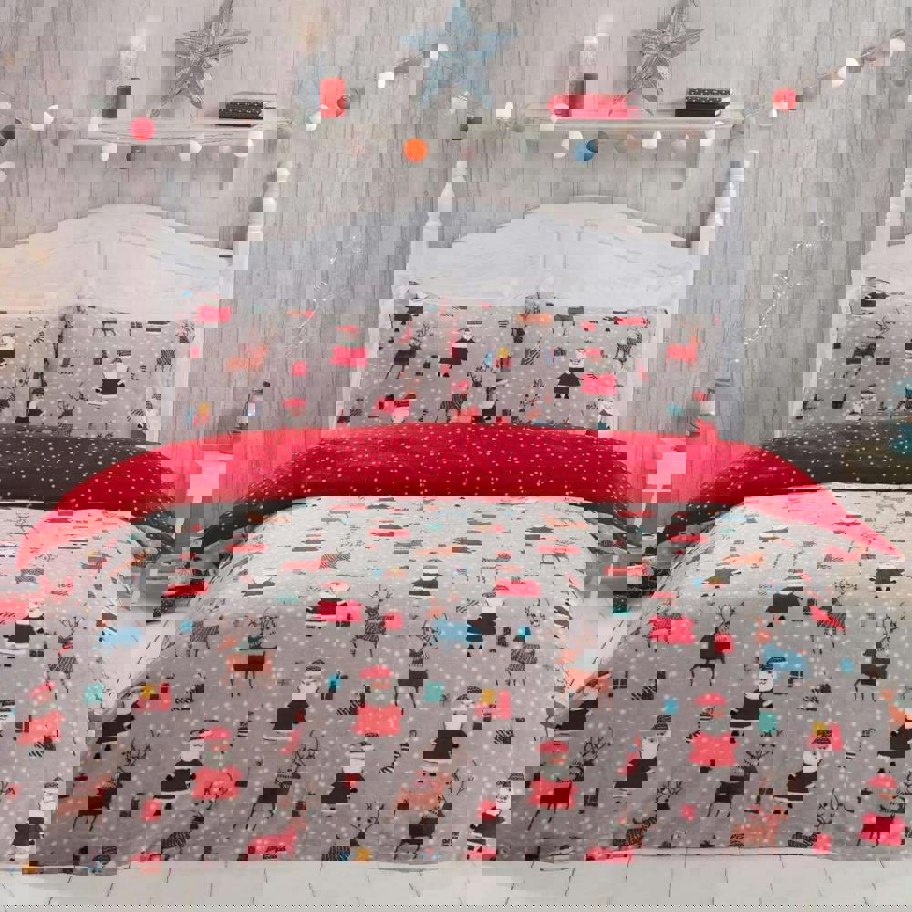 Santa Christmas Fleece Red Warm Cosy Super Soft Easy Care Reindeer Presents Xmas Grey Stars Reversible Duvet Cover Quilt Bedding Set with Pillowcase