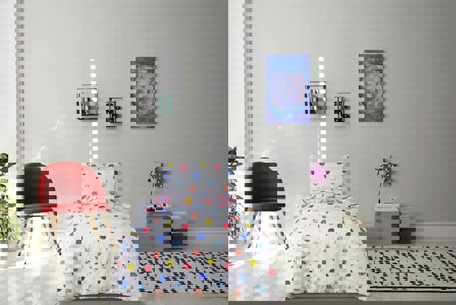 The reversible design adds versatility to the set, providing a second look with a vibrant multi coloured smiley face pattern on the reverse side.