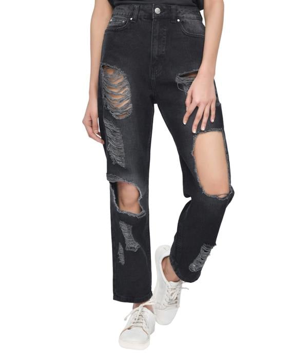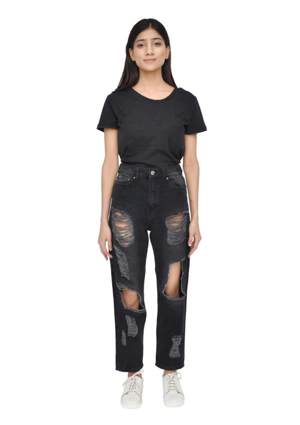 Crafted from durable 100% cotton, these mom jeans are as breathable as they are stylish, providing all-day comfort without compromising on quality. The relaxed fit and high-waisted silhouette offer a timeless appeal, while the ripped accents add a bold, modern touch.