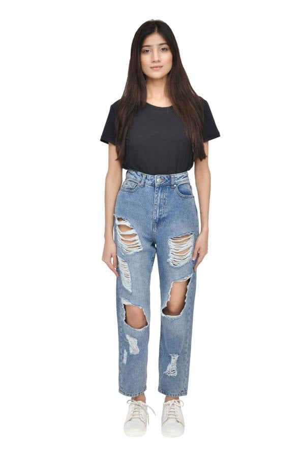 Crafted from durable 100% cotton, these mom jeans are as breathable as they are stylish, providing all-day comfort without compromising on quality. The relaxed fit and high-waisted silhouette offer a timeless appeal, while the ripped accents add a bold, modern touch.
