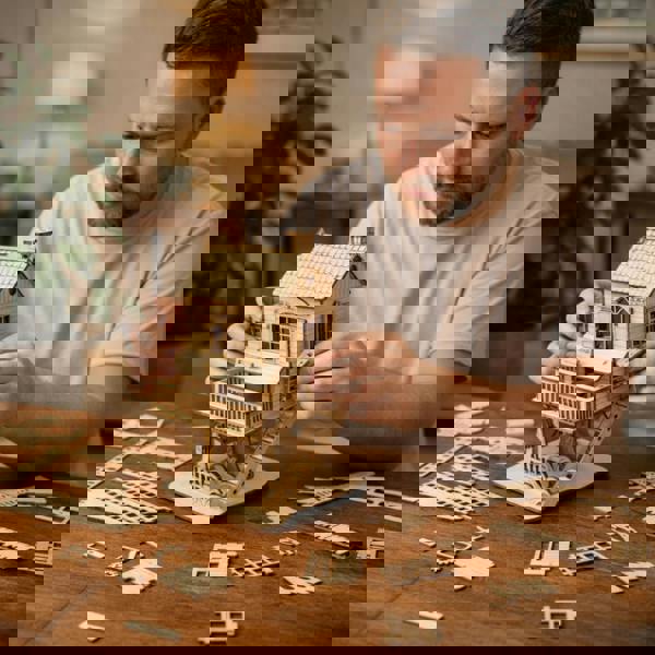 Made from precision laser-cut natural wood, this intricate treehouse model features a charming two-storey design complete with a balcony, ladder, chimney, carved base, and fine architectural details. Each piece fits together smoothly, creating a rewarding and relaxing build experience without the need for glue or special tools.