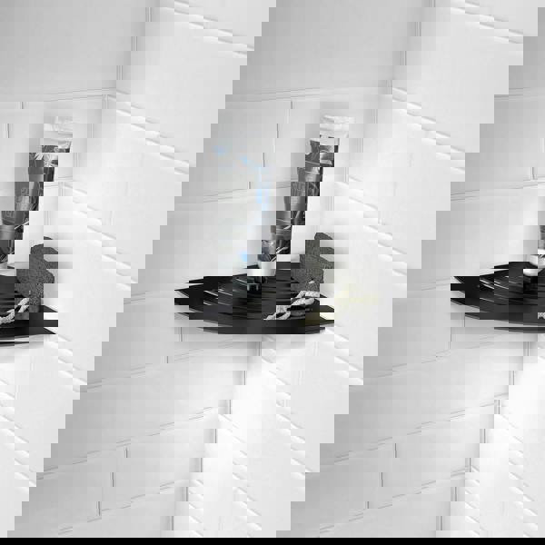 SIDELINE Grout Line Corner Shelf, with lines. Matt Black Stainless Steel. 200 x 200 mm.