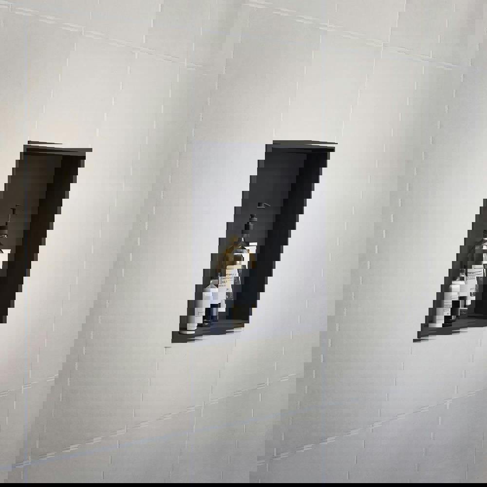 SIDELINE Shower and bathroom wall niche. Black. To be built into to the wall. 300 x 300 mm. Depth 100 mm.