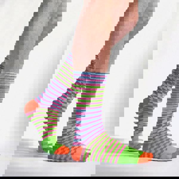 With vibrant green, pink and sky-blue stripes, finished with striking orange toe and heel details, this eye-catching design brings energy to every outfit. Whether paired with trainers for everyday wear or styled to make a statement, these colourful crew socks are made to stand out while delivering all-day comfort.