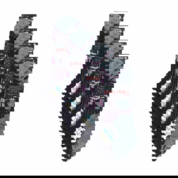 These ladies cycling socks are available in a pack of 12 and come in sizes 4-7 UK, 37-40 EU, 5-8 US. They are made from 45% polyester 35% acrylic 18% polyamide and 2% elastane. They are also safely machine washable. Do not Tumble Dry.