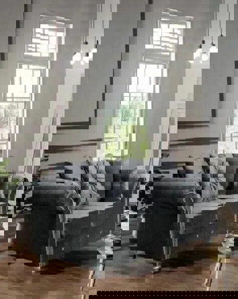 Upholstered in soft grey plush velvet, the Olympia Plush Sofa brings a modern look to everyday living. Classic studded arms and deep foam cushions create a supportive seat, making it a considered choice for relaxing in the living room.