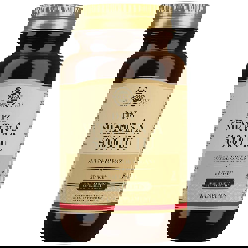 Solgar® Dry Vitamin A 5000 IU Tablets are suitable for Vegan and Vegetarian. The daily dose provides 5000 IU of Vitamin A, which equals 100% of the Nutrient Reference Value. The Vitamin A is presented in the form of retinyl palmitate, which is the less irritating form of retinol and therefore gentle on the intestines.