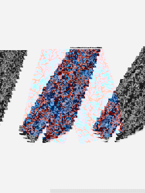 Soli Swim boys’ beach shorts in blue with an all-over coral, starfish and shell print in blue and orange. The woven design includes an attached inner mesh brief and three pockets for everyday essentials. An elasticated waistband and drawstring fastening keep the fit secure, making them a practical choice for beach and pool days. UPF 50+ protection is stated on the product information.