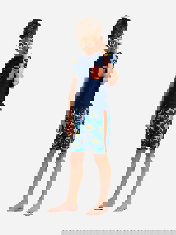 Soli Swim boys dinosaur swim shorts in navy bring a playful look to swim days, with an all-over dinosaur print. The UPF50+ rating is stated for added sun protection, making them a practical choice for holidays and time in the water.