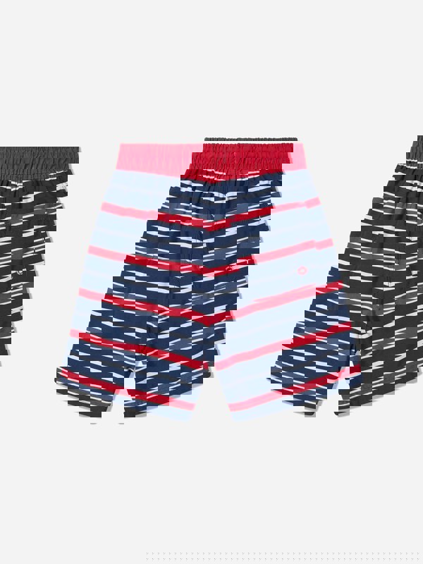 Soli Swim boys striped beach shorts in red for SS2025. The bold red colourway is finished with stripes for a clean, graphic look that stands out at the beach or pool. Made with UPF50+ material, these shorts provide sun protection for outdoor wear.