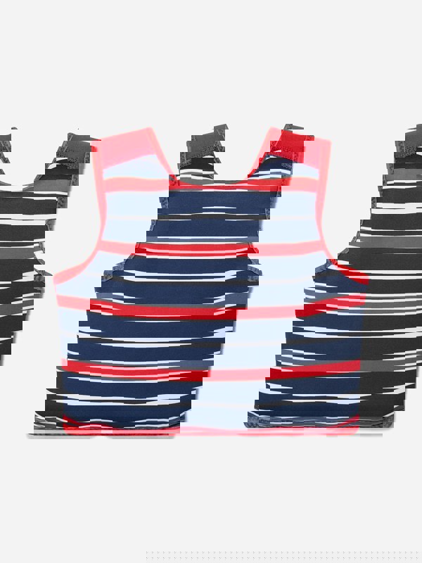 This boys striped float jacket from Soli Swim comes in red with a UPF50+ rating for UV protection. Integral floats add buoyancy, combining a practical swim piece with a bold striped look for SS2025.