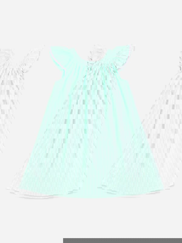 This girls summer dress from Soli Swim comes in green cotton with a lightweight, soft handle. Multicoloured tassel ties sit at the front, while pink ric rac trim runs along the sleeve edges for a bright contrast detail.