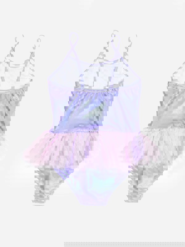 This girls swimsuit from Soli Swim comes in purple with a pink and purple abstract design. The silky material has an iridescent pattern and UPF 50+ protection. A ruffled pink tulle trim sits at the waist, adding a tutu-style finish.