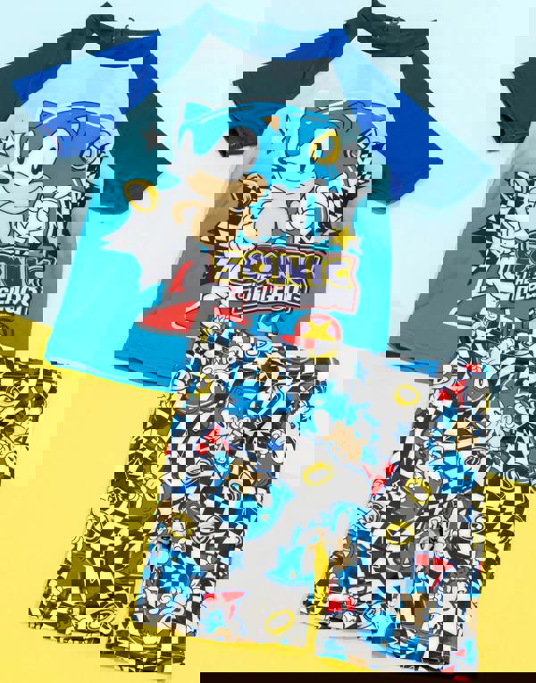 Get ready to race and swim in Sonic The Hedgehog style! The two-piece t-shirt and shorts swim set comes in blue, featuring the speedy hedgehog surrounded by race checkers and power rings