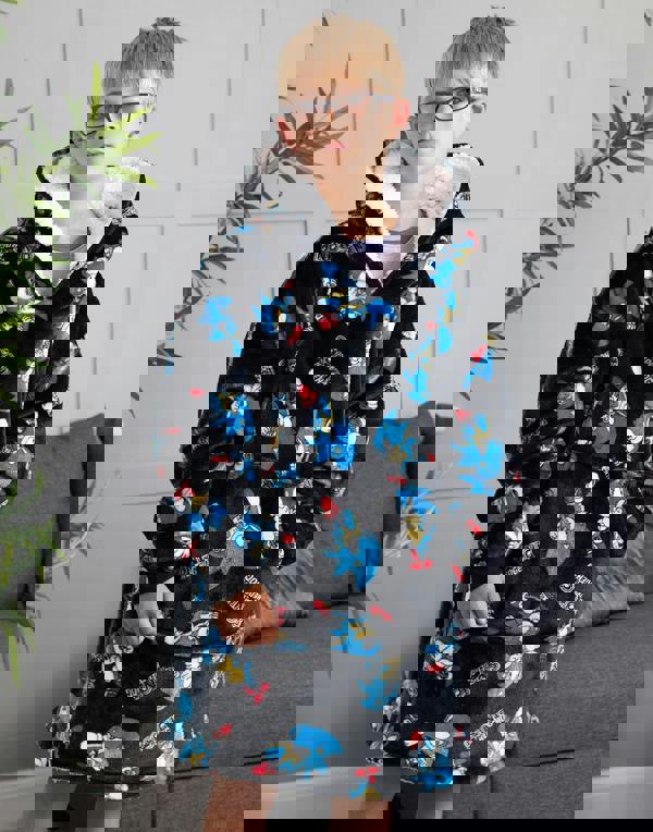 Officially licensed, the children and teens wearable blanket comes in black, featuring the speedy blue hedgehog, Sonic, with the official logo in an all-over print