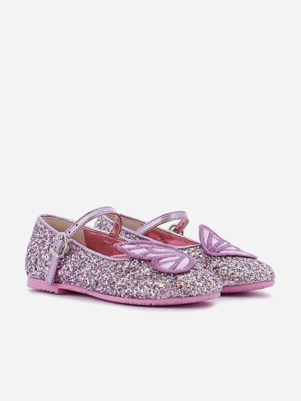 These Sophia Webster girls’ Moon Beam ballerina pumps bring a distinctive look to everyday outfits, finished in purple glitter with metallic leather details. Embroidered butterfly wings sit at the toe, paired with a round-toe shape for a classic flat silhouette. A buckle strap crosses the top of the foot and secures with a buckle fastening, completed with gold-tone hardware.